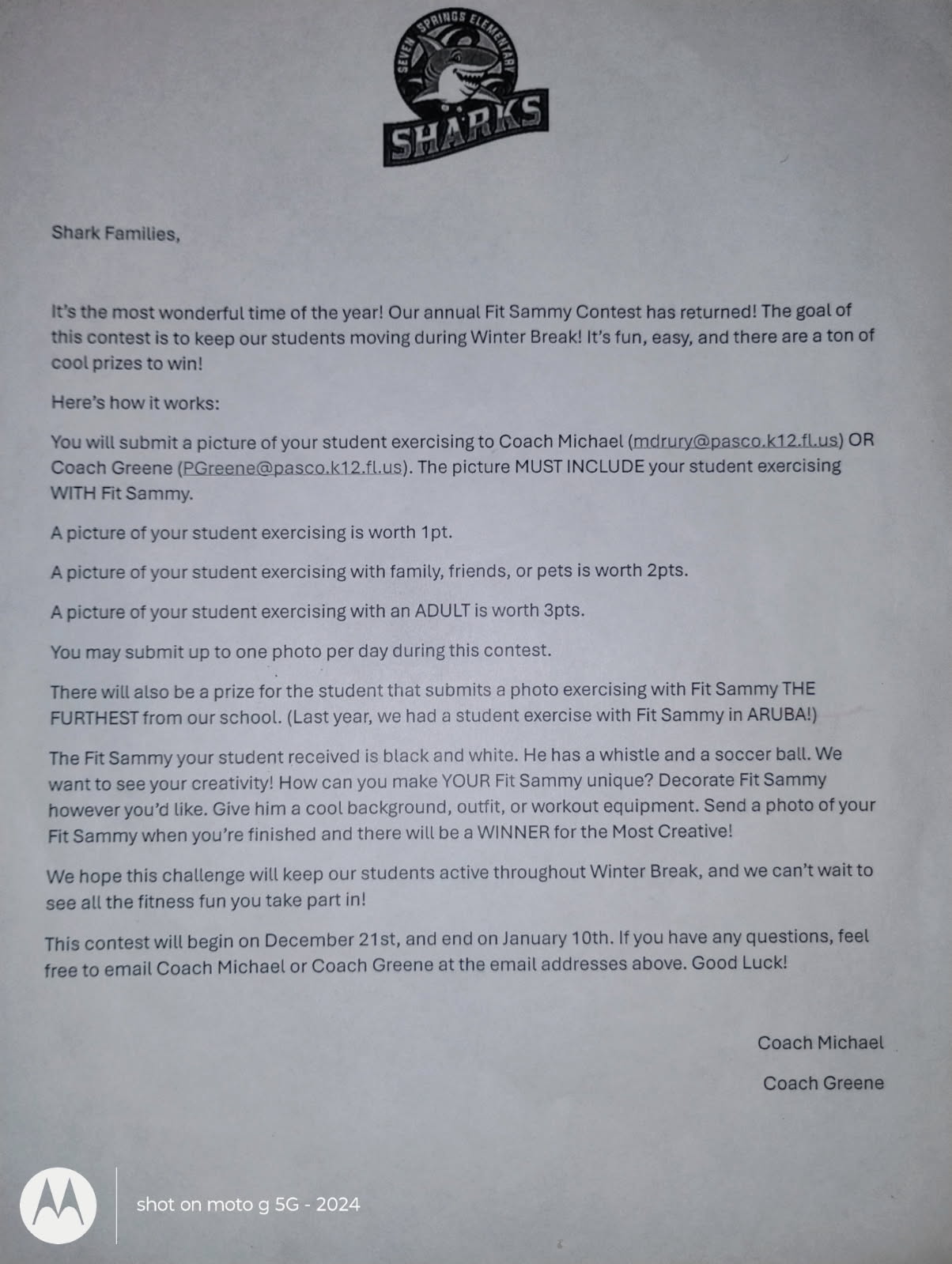 Fit Sammy Starts tomorrow! This a perfect way to incorporate Physical Fitness into your busy holiday schedules. . The students all had these flyers in their take home folders on Tuesday and will also be up on all our social media platforms.